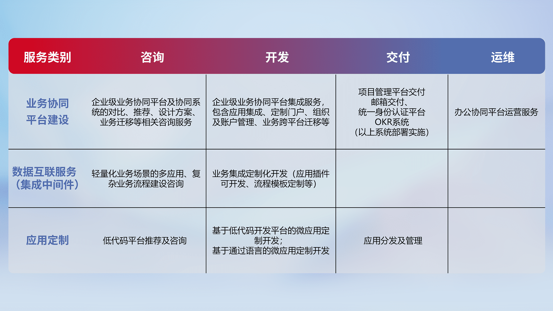 针对钉钉、、、企微、、、IDaas等平台级产品提供产品的规划、、方案、、交付、、、定制化开发等服务,,,实现如统一协同办公、、、、智能客户服务、、、混合会议管理、、、、智能数据查询、、、等业务场景,,,实现数字化转型。。